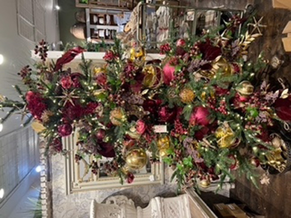 We used your dried hydrangeas and multiple shades of cranberry colored balls