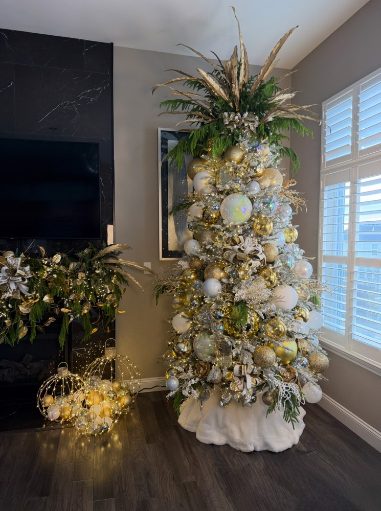 This project features an elegant, gold and white Christmas tree designed to evoke timeless holiday luxury. The tree is accented with manzanita branches to add texture and visual depth. Oversized 12 inch ornaments serve as statement pieces throughout the tree, anchoring the design, and creating a bold focal point. These are complimented by a mix of smaller ornaments and various size, strategically layered to achieve balance, movement, and dimensional interest. The cohesive, golden white palette reflects light beautifully, resulting in a refined, luminous finish.
