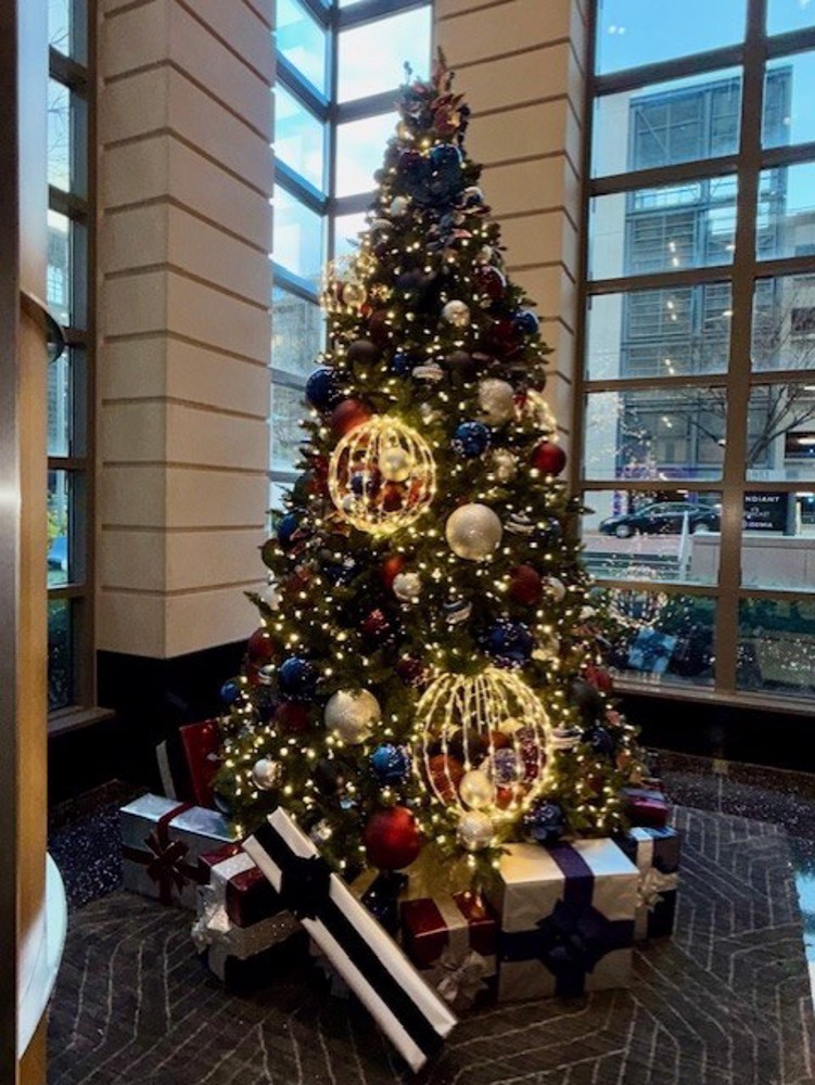 12' Fully Decorated Tree with combination of florals, filler ornaments and lit spheres