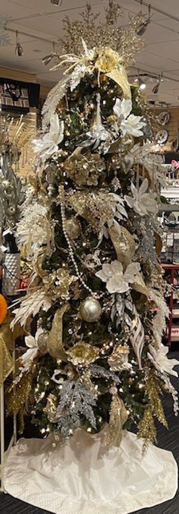 The slim line tree was transformed into a luminous of elegance with champagne and ivory. It was decorated with luxurious champagne gold embroidery ribbon, creating a prestigious statement. Pearl and rhinestone garland adorned the tree, complemented by triple bead garland with gold and pearls. Decorative picks were strewn across the tree, included the 15” white deluxe magnolia 8” flower, champagne hydrangea spray, white glitter bay leaf spray, silver glitter bay leaf spray, glitter wild huck spray in silver, white and gold. Creating a dazzling topper with champagne designers stems. Every detail coming together to create a sophisticated look in the smallest of spaces.