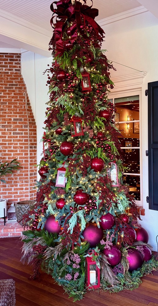 This Christmas tree is a bold, elegant statement anchored in rich wine tones. Graduated ball ornaments in 12”, 10”, 8”, 6”, and 4” are layered intentionally—creating depth at the base and a refined taper as the eye moves upward. Architectural lantern accents add warmth and old-world charm, giving the tree a collected, story-driven feel. The look is finished with a coordinating ribbon bow topper, layered in 4”, 2.5”, and 1” ribbons for dimension and movement. Lush greenery and warm lights tie it all together, resulting in a dramatic yet timeless holiday centerpiece.
