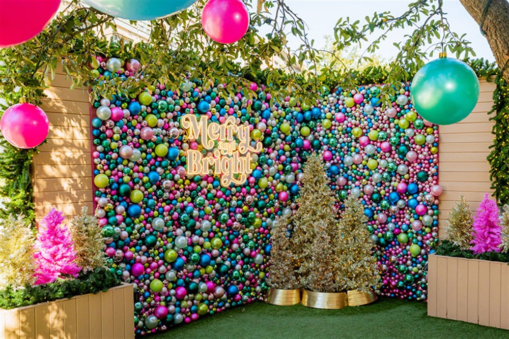 A bright and cheery photo moment comprised of thousands of ornaments. Inspired by a holiday food display at Selfridges, the team used our modern holiday color palette to create more than 14 panels of strung various sized ornaments.