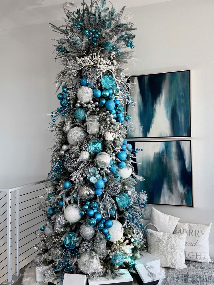 This tree feels polished, layered, and intentionally luxurious. An iced, frost-kissed base sets the tone, giving the entire design a finished, wintry presence. Oversized silver and aqua jewel-style ornaments are thoughtfully mixed with varying textures—matte, glass, and crystal-inspired finishes—to create depth and visual movement. The cool metallics and vibrant aqua tones pop against the frosted branches, while clustered placement adds drama without overwhelm. The result is a refined, high-impact holiday statement that feels complete, cohesive, and effortlessly elegant.